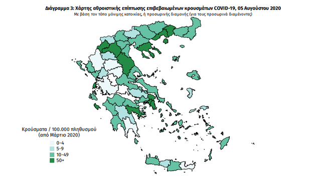 Ο παρακάτω χάρτης αποτυπώνει τη γεωγραφική κατανομή των συνολικών κρουσμάτων COVID-19 (από την αρχή της επιδημίας) ανά Περιφερειακή Ενότητα της χώρας, με βάση την δηλωθείσα διεύθυνση μόνιμης κατοικίας του ασθενούς, ή τη διεύθυνση προσωρινής διαμονής για τους τουρίστες και άλλους προσωρινά διαμένοντες στην Ελλάδα. Συμπεριλαμβάνονται τόσο κρούσματα με ιστορικό ταξιδιού (εισαγόμενα) όσο και κρούσματα με πιθανή εγχώρια μετάδοση.