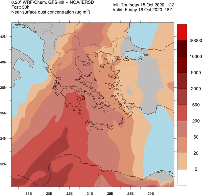 Επιπροσθέτως, όπως φαίνεται στο χάρτη που ακολουθεί, αυξημένες θα είναι οι συγκεντρώσεις Αφρικανικής σκόνης σε πολλές περιοχές της χώρας, ενώ άνεμοι νοτίων διευθύνσεων με εντάσεις έως 6 μποφόρ θα πνέουν στο Αιγαίο και έως 7 μποφόρ στο Ιόνιο.